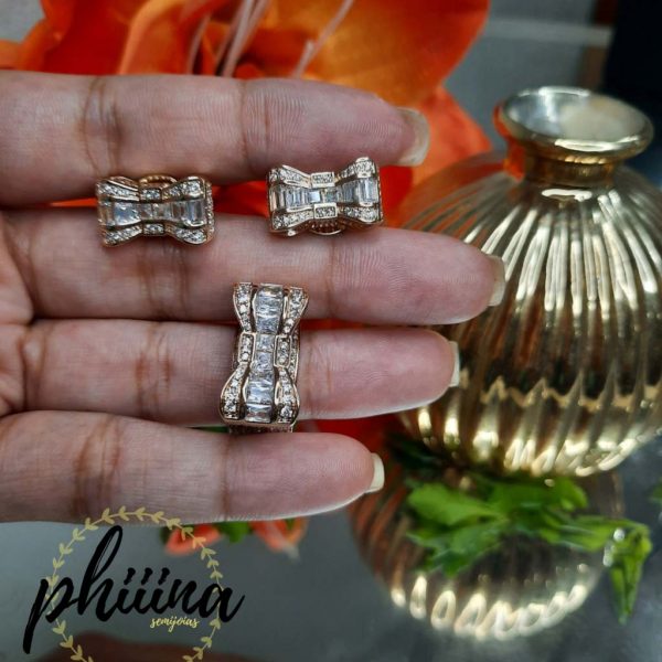 • Um anel em formato de laço cravejado de Zircônias Brancas.